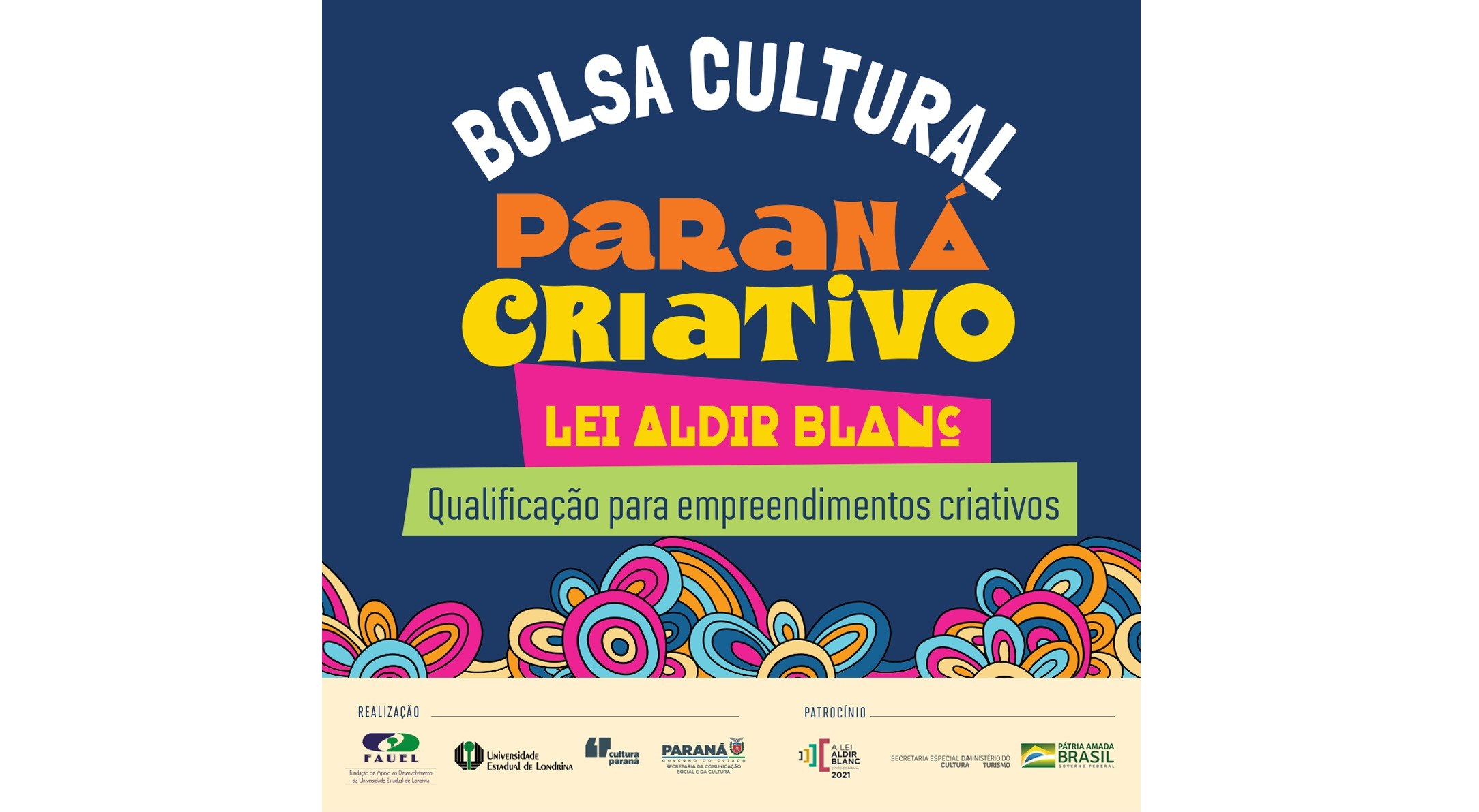 A Pró-Reitoria de Extensão, Cultura e Sociedade (PROEX), juntamente com a Fundação de Apoio ao Desenvolvimento da Universidade Estadual de Londrina (FAUEL), abrem nesta segunda-feira (03/01) as inscrições para o Programa Bolsa Cultural Paraná Criativo/Lei Aldir Blanc – Qualificação para Empreendimentos Criativos do Setor Cultural. O edital é resultado de um Termo Técnico entre a Secretaria de Estado da Comunicação Social e da Cultura (SECC), UEL e Fundação de Apoio (FAUEL) para garantir que os recursos da Lei Aldir Blanc (Lei Federal nº 14.017/2020) possam apoiar empreendimentos da cultura afetados pelos impactos da pandemia.